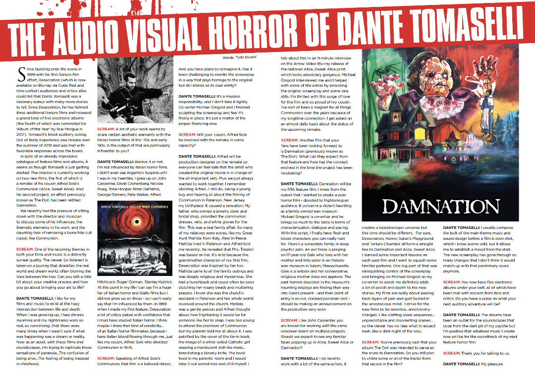 “SCREAM IN THE DARK sounds like it was intended to be put on at a Halloween party, to set the mood for a spooky evening, or maybe greet--and terrify--trick-or-treaters. It would also be a perfect soundtrack for any kind of haunted attraction. Tomaselli's work is atmospheric and very moody--a horror-movie soundtrack without the horror movie. Scream in the Dark stands as a sound investment for fans of all things macabre.”Fangoria